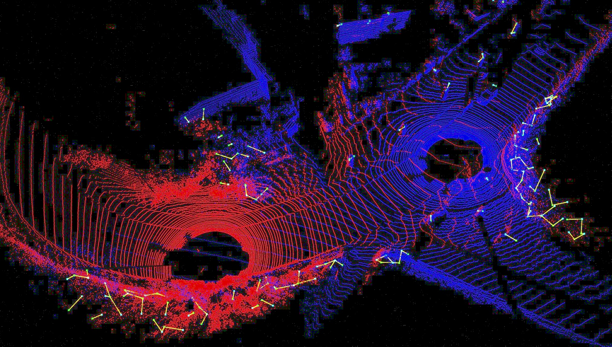Figure 1: With differentiable GICP algorithm, we can train our neural network to infer importance, or weight, of each point in the point cloud that could be used in later GICP step. In the figure, points with lower weights are rendered in green, and those with higher weights are rendered in red. Note that points on grounds, which often exhibit non-uniform distribution, have generally lower weights than the others.
